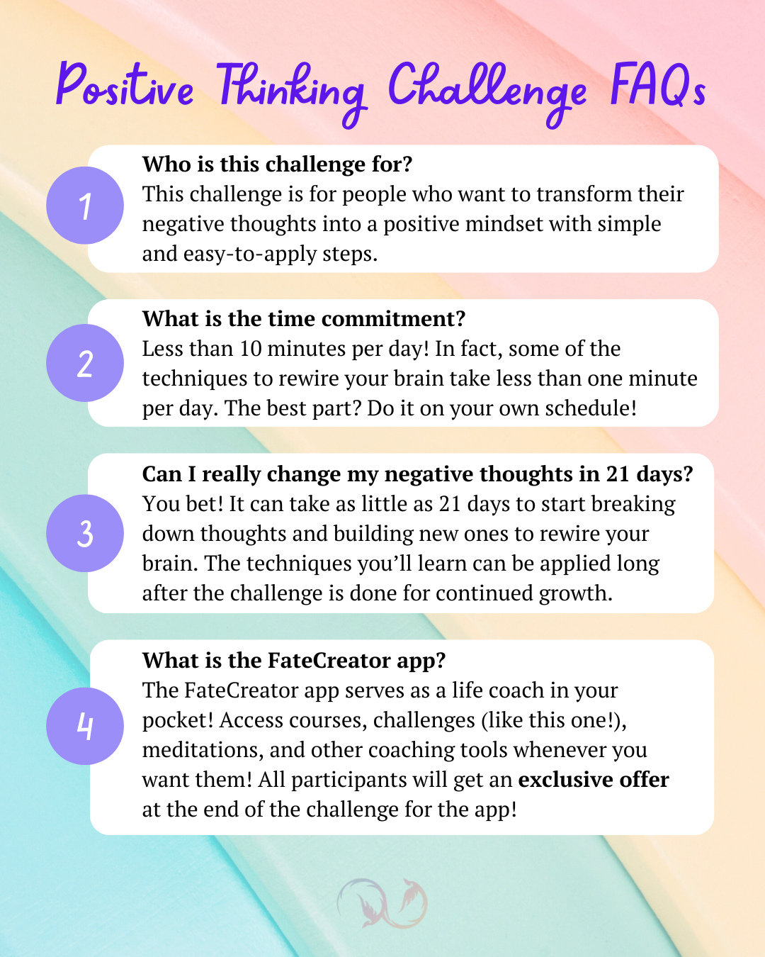 We've got answers. Sending any questions you may have about the 21-Day Positive Thinking Challenge our way and be sure to check out the FAQs above.